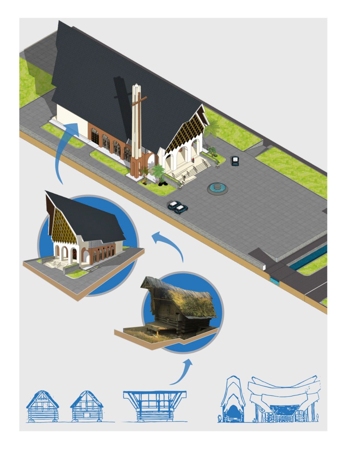 Konsep utama dalam desain tersebut menitikberatkan pada reinterpretasi struktur tradisional Toraja yang adaptif terhadap lingkungan, namun diterapkan dengan material dan teknologi konstruksi modern. Selain itu, bangunan dirancang responsif terhadap iklim tropis melalui optimalisasi sirkulasi udara alami dan pencahayaan, sehingga menciptakan ruang ibadah yang nyaman dan efisien energi.