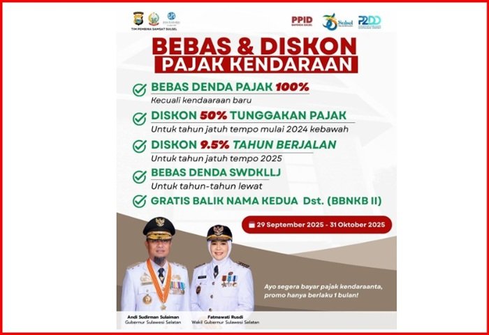 Waranews.id — Pemerintah Provinsi Sulawesi Selatan resmi memberlakukan insentif Pajak Kendaraan Bermotor (PKB) mulai 29 September hingga 31 Oktober 2025 melalui Program Bebas dan Diskon Pajak Kendaraan.